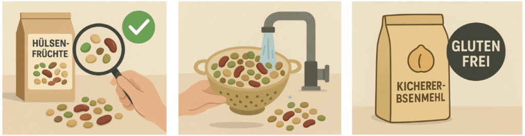Wichtig: Dieses Vorgehen sollte auch bei Hülsenfrüchten ohne Spurenhinweis vorgenommen werden, sofern sie kein Glutenfrei-Label tragen.